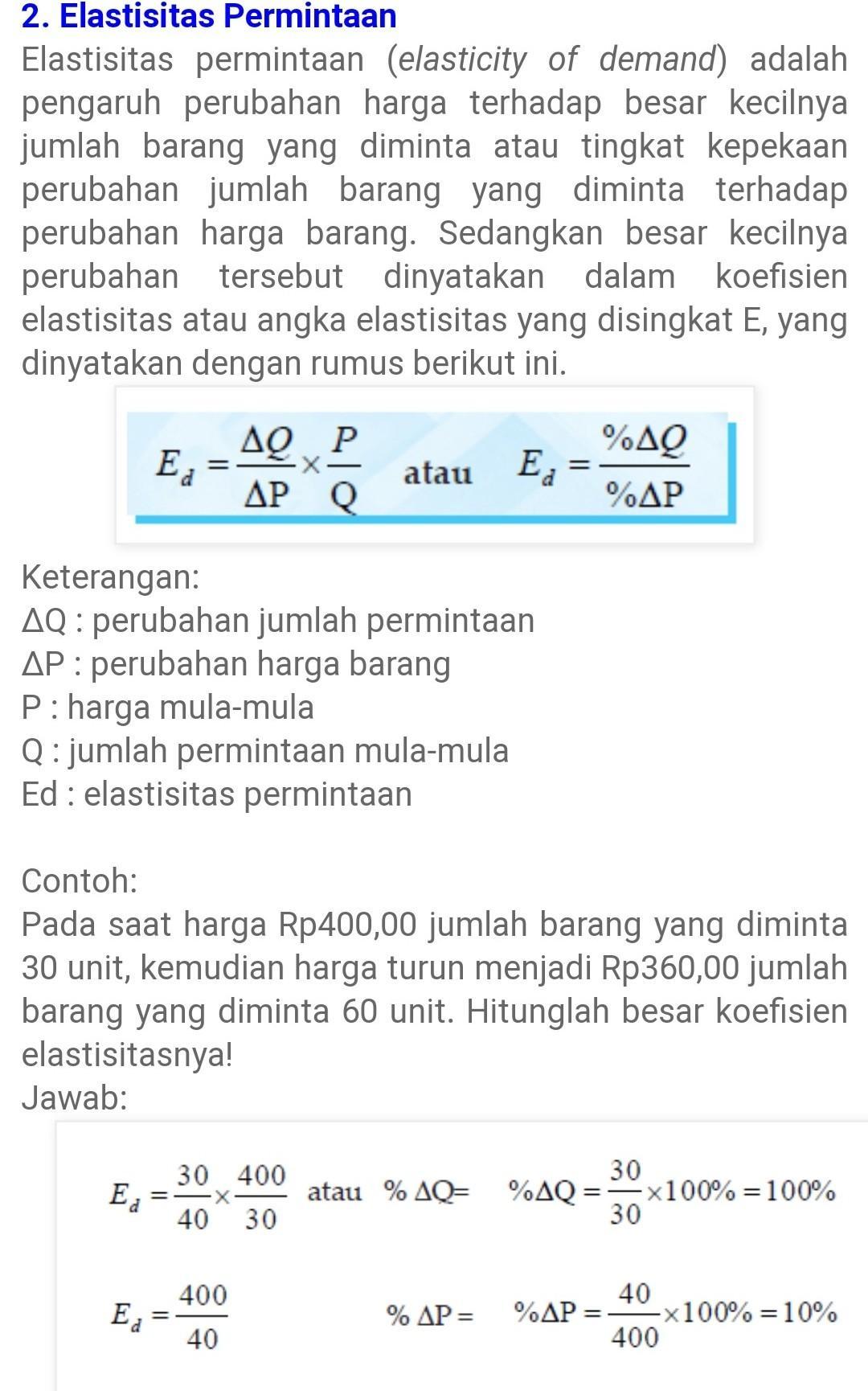 Kita lihat menggunakan perhitungan berikut untuk contoh sebelumnya:. Gambar 3 kurva permintaan elastis unitercontoh produk yang elastisitasnya uniter. Kali ini kita akan membahas materi ekonomi tentang elastisitas permintaan. Dan, dalam rumus matematika, akan terlihat seperti ini:. Dapatkan update berita pilihan dan breaking news setiap hari dari kompas.com.